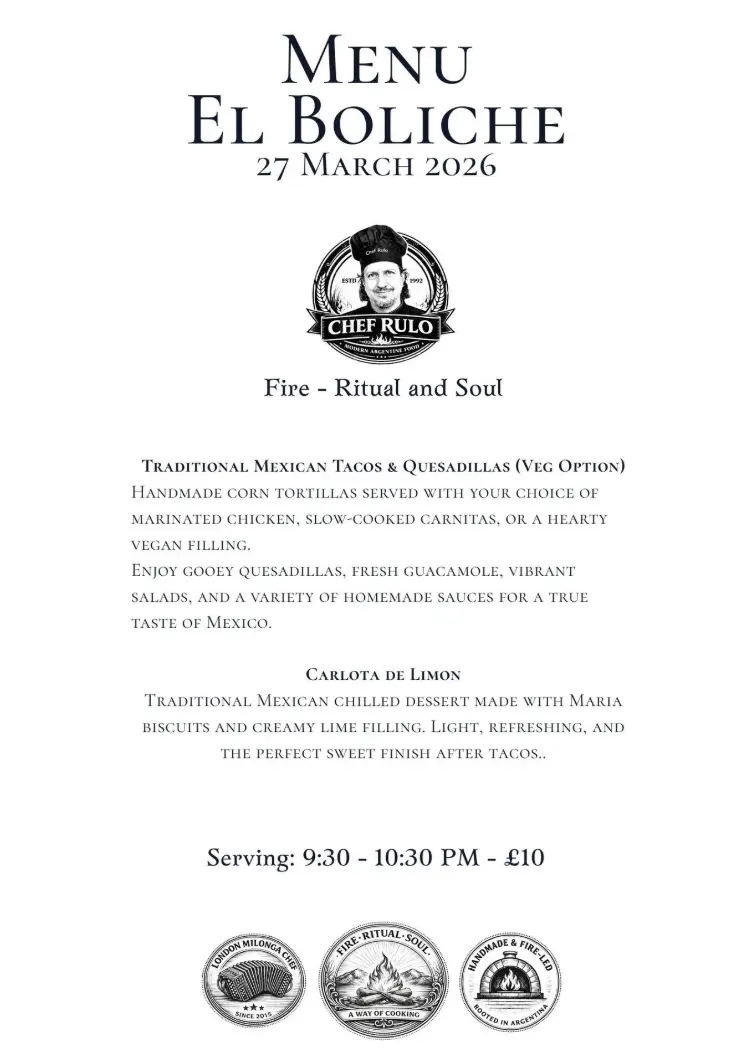 Please note: this booking is for the meal only. If you’d like to take part in any Tango Space classes or dance at the milonga, you can pay separately at the reception on the night.