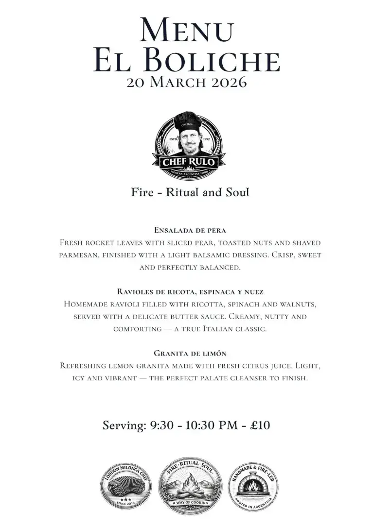 Please note: this booking is for the meal only. If you’d like to take part in any Tango Space classes or dance at the milonga, you can pay separately at the reception on the night.